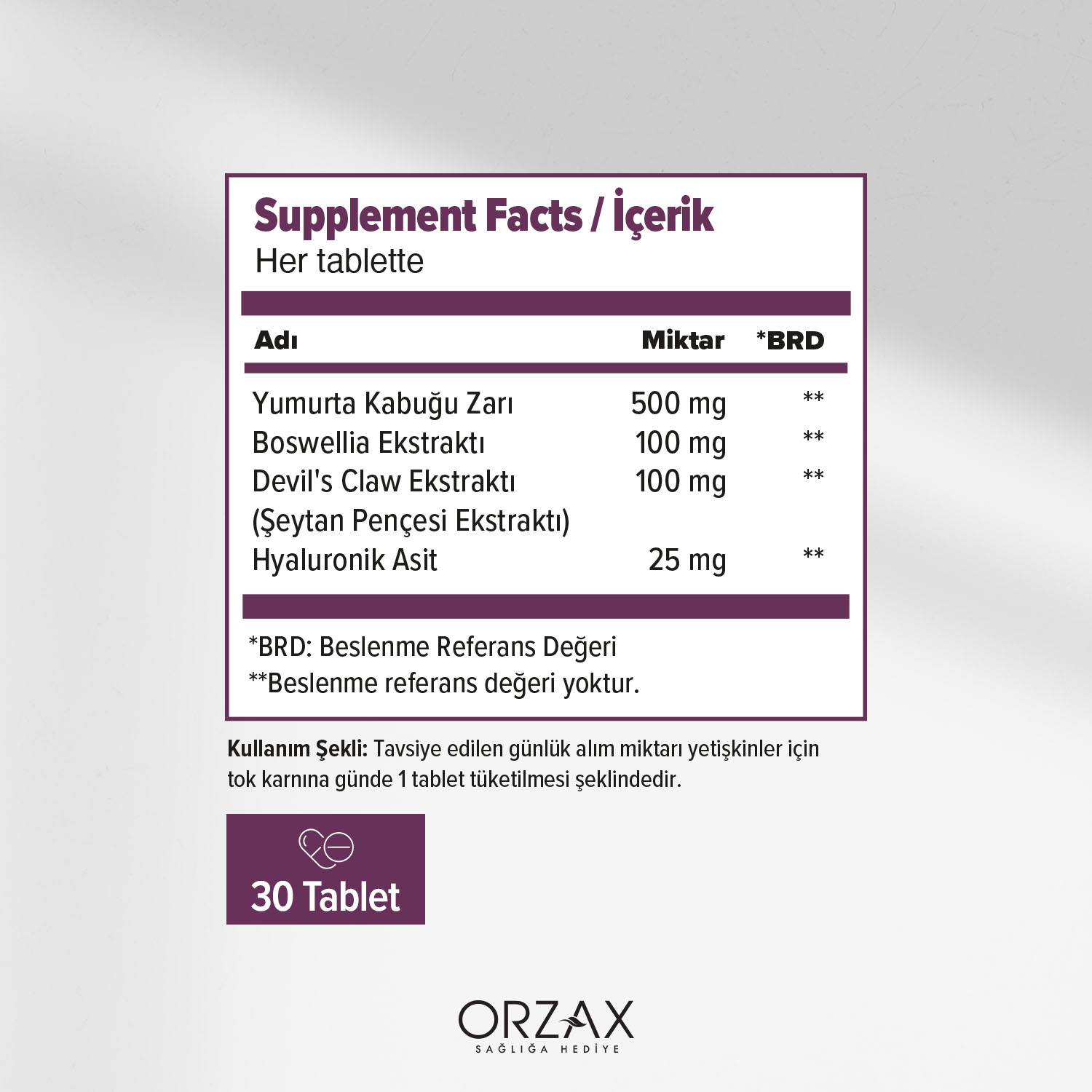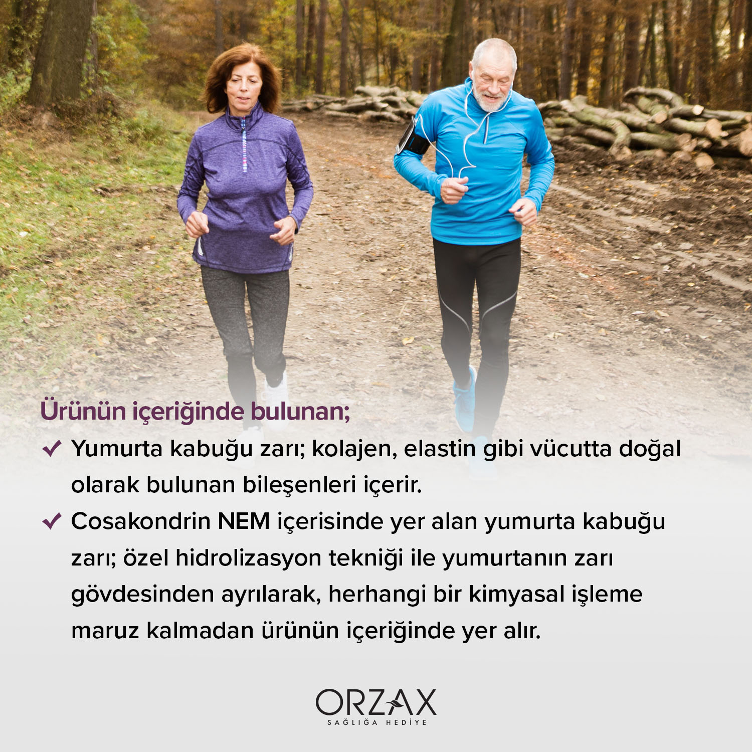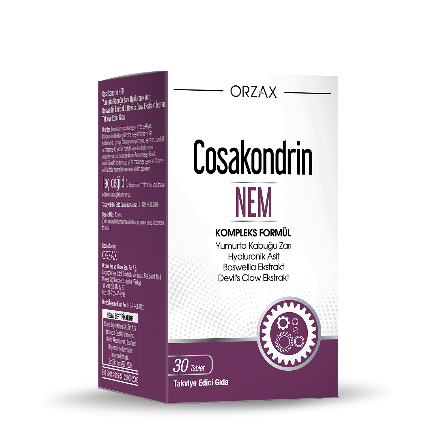 Cosakondrin NEM patentli yumurta kabuğu zarı ekstresi içerir. Özel hidrolizasyon tekniği ile yumurtanın zarı gövdesinden ayrılarak, herhangi bir kimyasal işleme maruz kalmadan ürünün içeriğinde yer almaktadır. 30 tablet içerir.