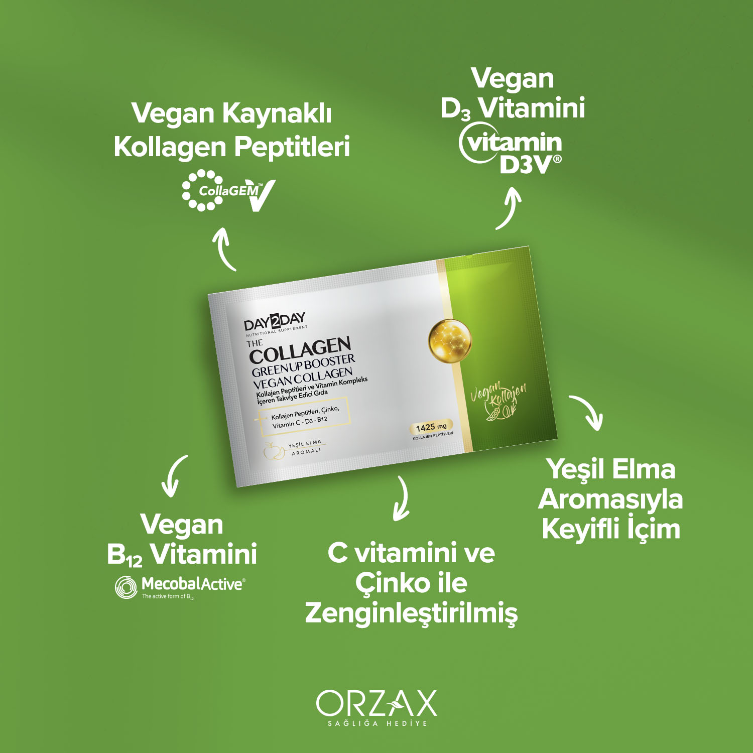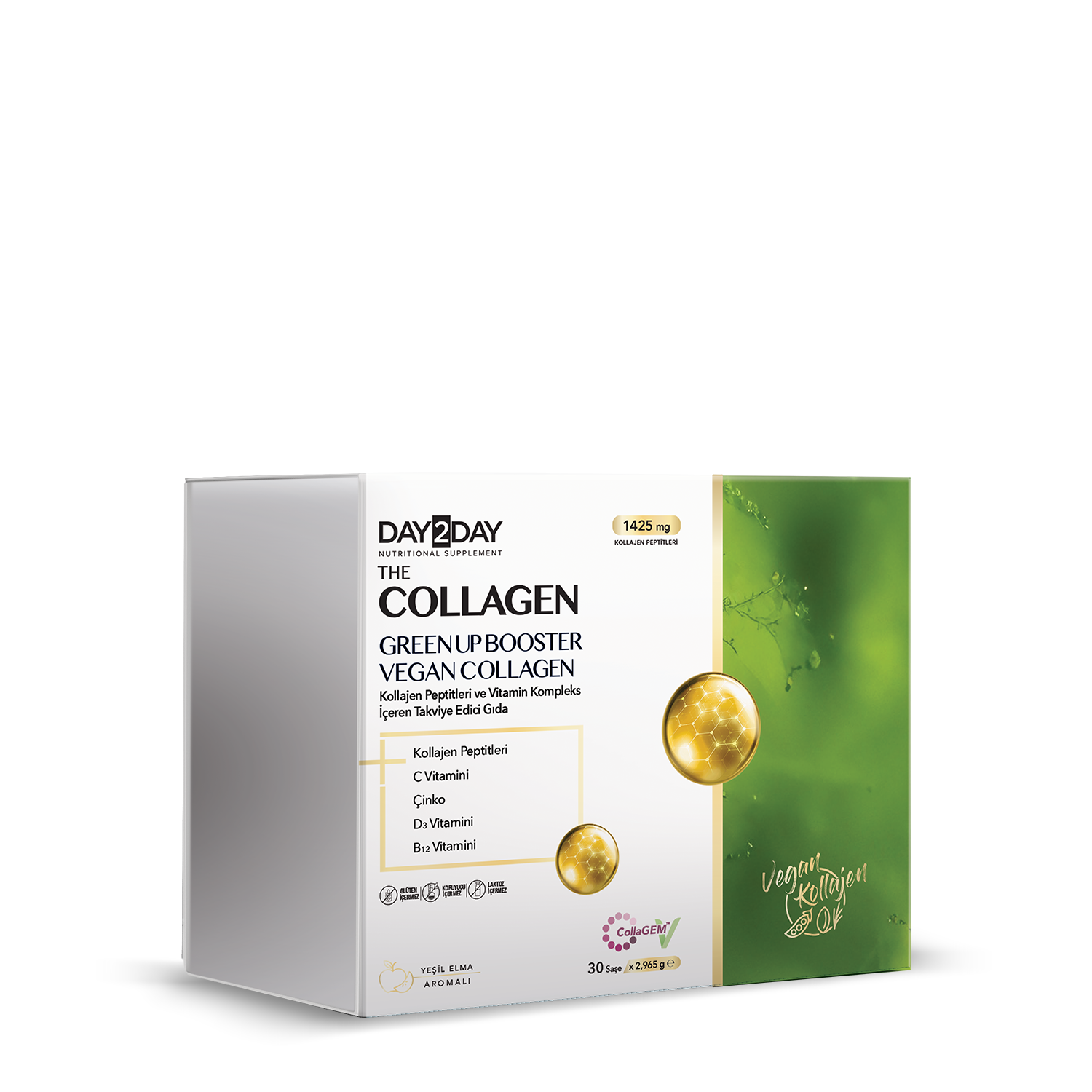 Day2Day The Collagen Green Up Booster, her saşede 1,425 mg CollaGEM patentli vegan kolajen peptitleri, mineral ve vitaminler içeren bir gıda takviyesidir. İçeriğindeki B12 vitamini aktif formdadır ve D vitamini patentli vegan D vitaminidir. Yeşil elma aromalı saşe formu sayesinde suya karıştırılarak pratik ve keyifli bir içim deneyimi sunar.