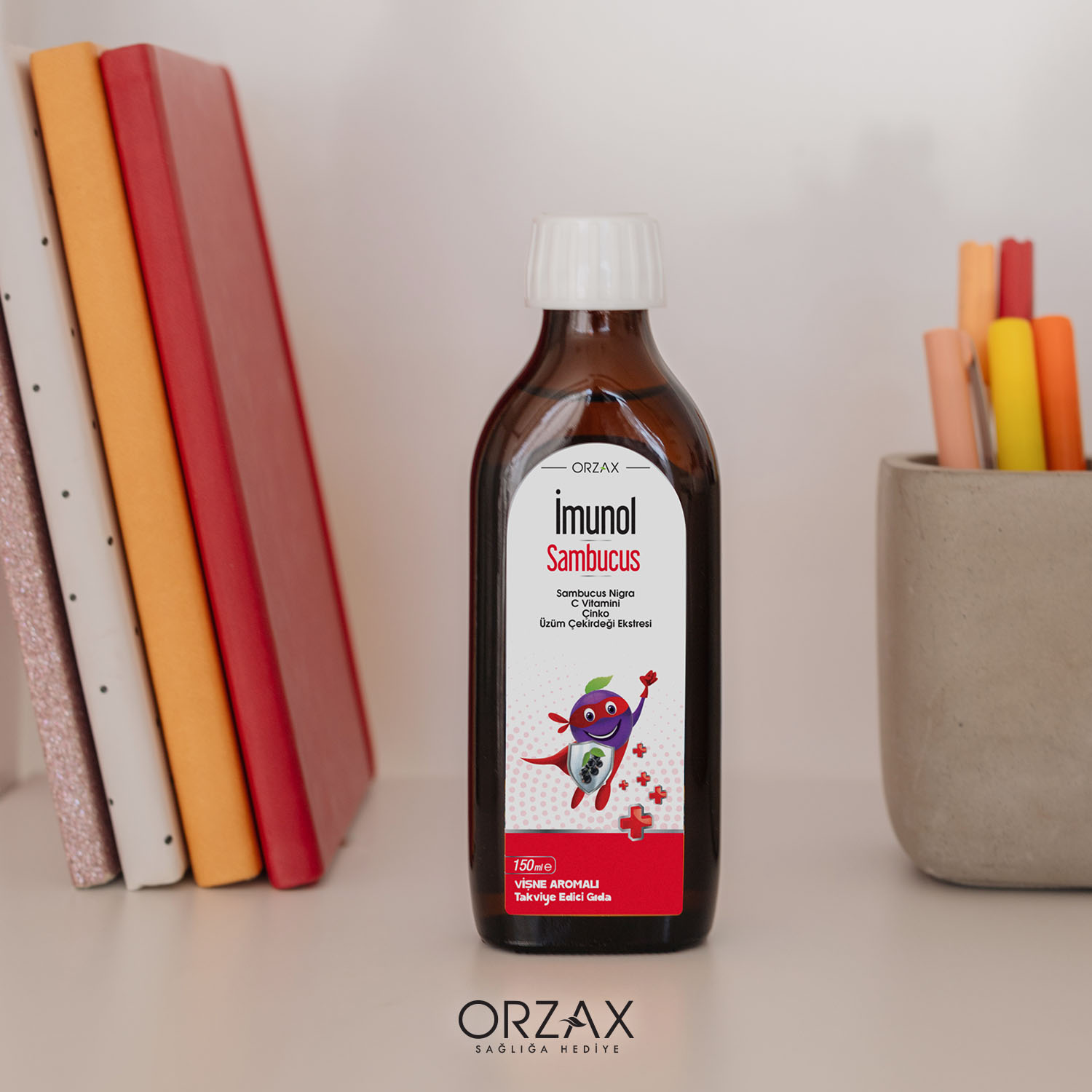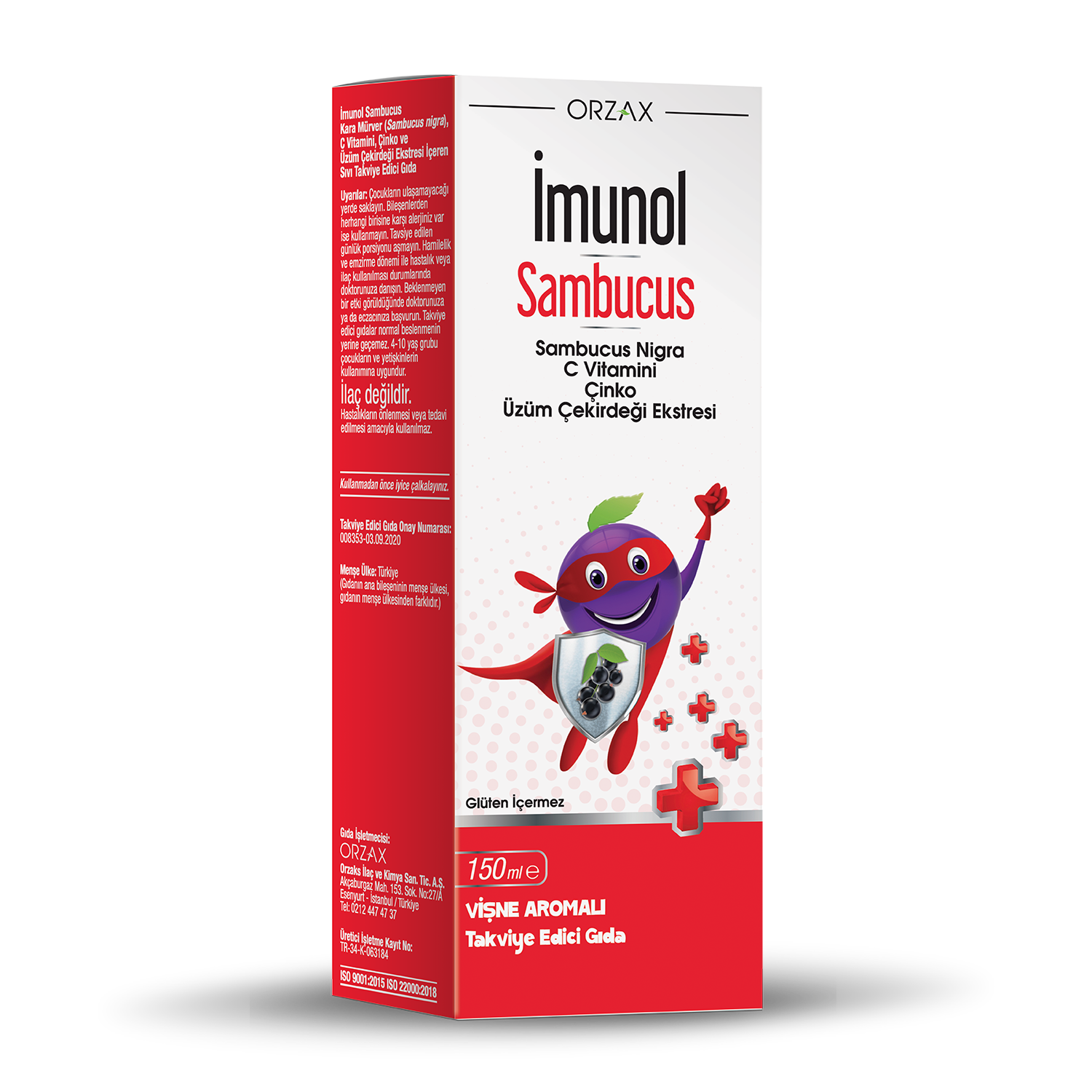 İmunol Sambucus Şurup her 5 ml’de 100 mg Kara Mürver (Sambucus nigra), 50 mg üzüm çekirdeği ekstresi, mineral ve vitamin içeren bir gıda takviyesidir. Vişne tadıyla keyifli bir içim sunar. Tavsiye edilen günlük kullanım şekli 4-10 yaş grubu çocuklar için 5 ml, yetişkinler için 10 ml’dir. Glüten içermez.