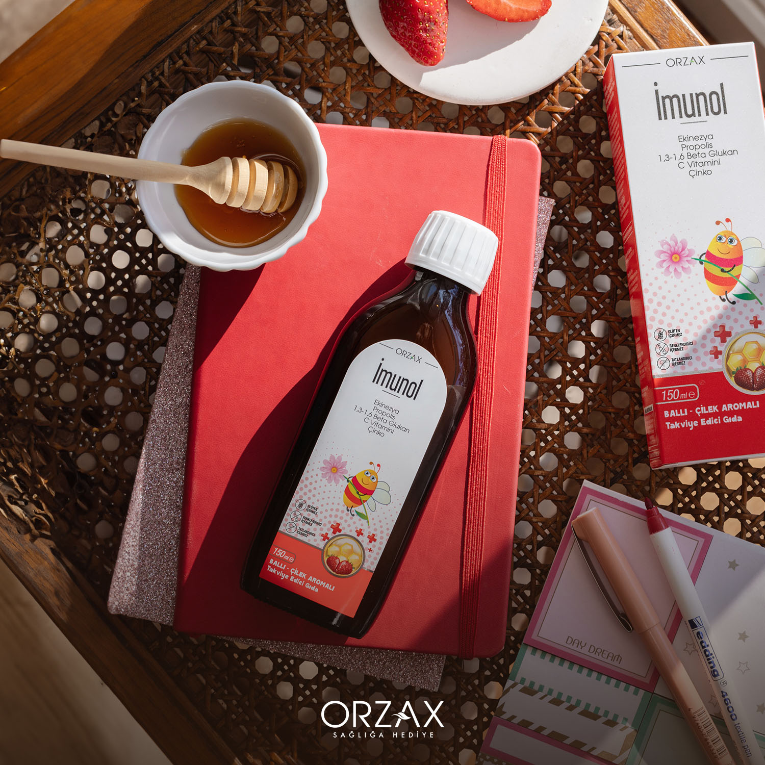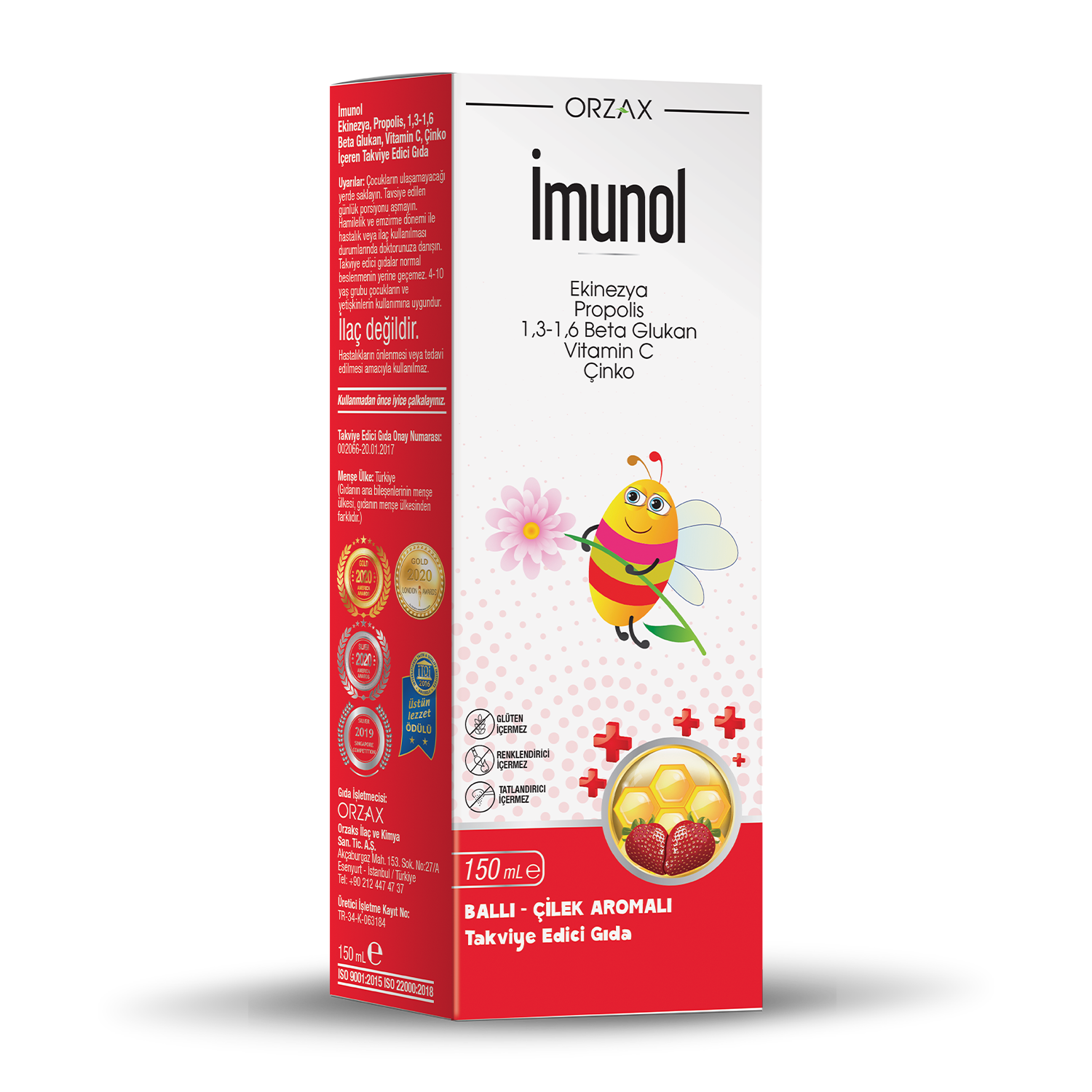 İmunol Şurup her 5 ml’de 1,3-1,6 Beta Glukan, Ekinezya, Propolis, vitamin ve mineral içeren bir gıda takviyesidir. Çilek tadıyla keyifli bir içim sunar. Glüten, renklendirici ve tatlandırıcı içermez. Tavsiye edilen günlük kullanım şekli 4-10 yaş grubu çocuklar için 5 ml, yetişkinler için 10 ml’dir.