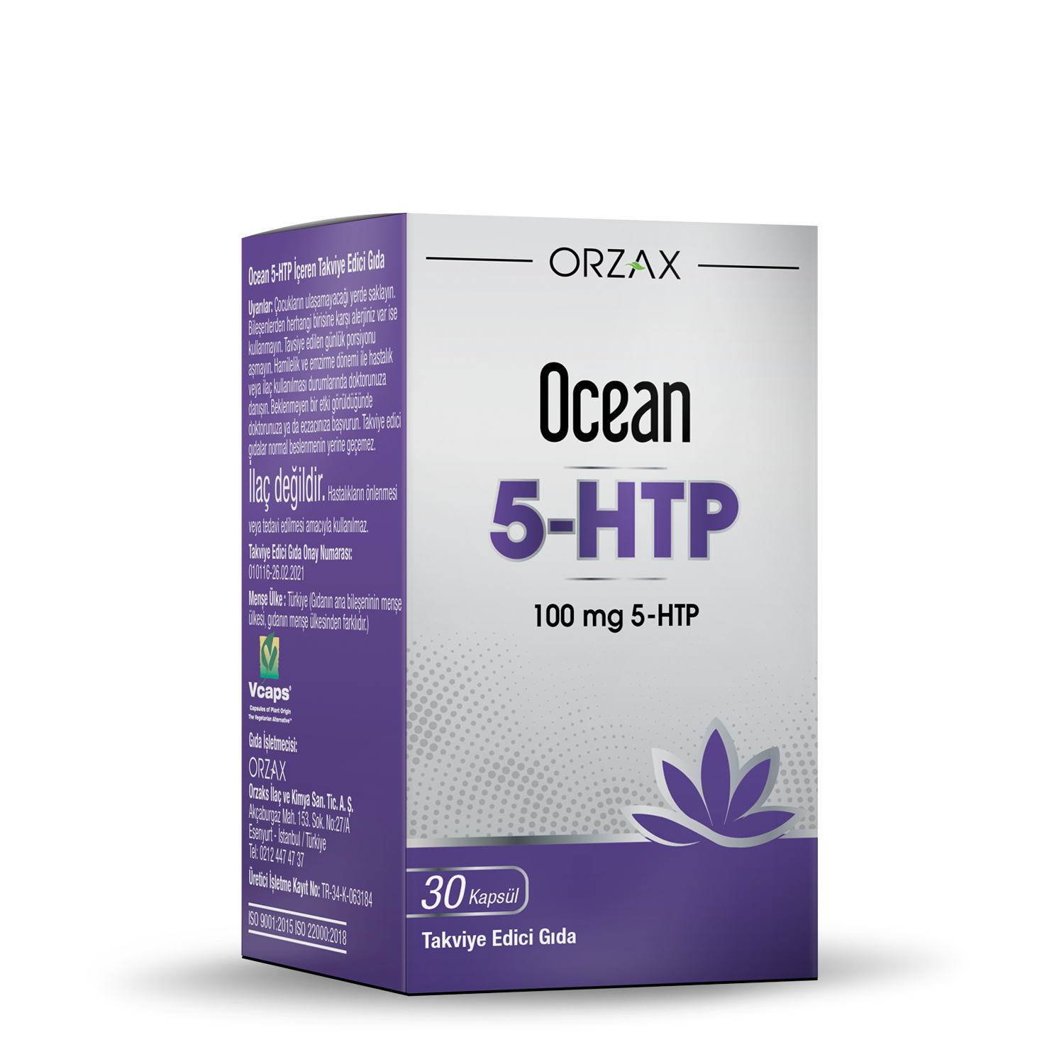 5-HTP, Griffonia simplicifolianın tohumlarından ekstraksiyon ile üretilir. Ocean 5-HTP her kapsülünde 100 mg 5-HTP içeren bir gıda takviyesidir. Vcaps bitkisel kapsül teknolojisi ile üretilmiştir.