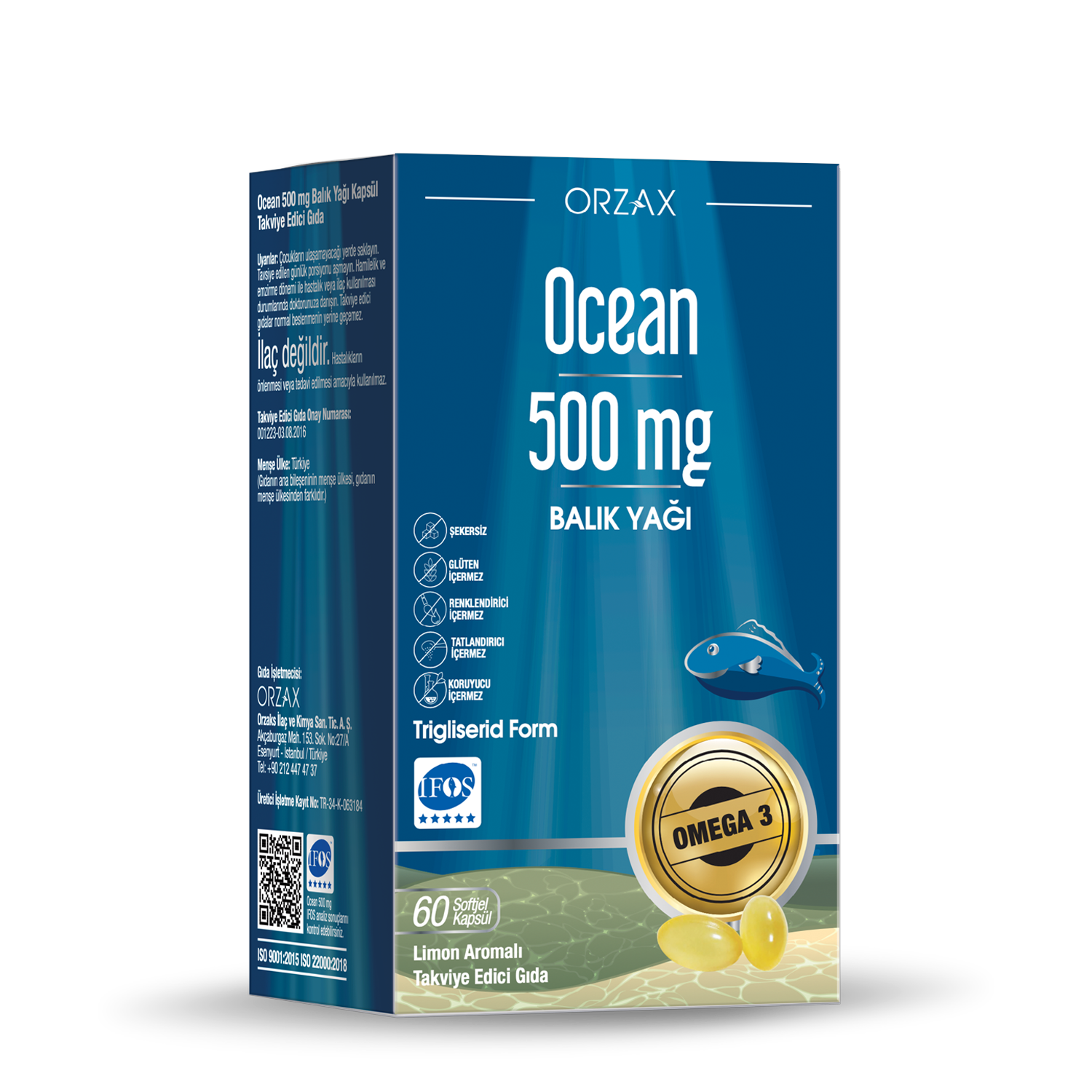 Ocean 500 mg Balık Yağı bileşiminde; ağır metallerden uzak, temiz ve soğuk sularda yaşayan, küçük cins balıkların gövde yağları kullanılmaktadır. Üretim esnasında kimyasal çözücüler kullanılmaz, sadece mekanik yöntemler tercih edilir. Trigliserid formda, softjel kapsül formunda ve limon aromalıdır. Ocean 500 mg her üretim serisinde; saflık, tazelik, içerik malzemesi ve kalitesiyle IFOS 5 yıldız kalite onayına sahiptir.