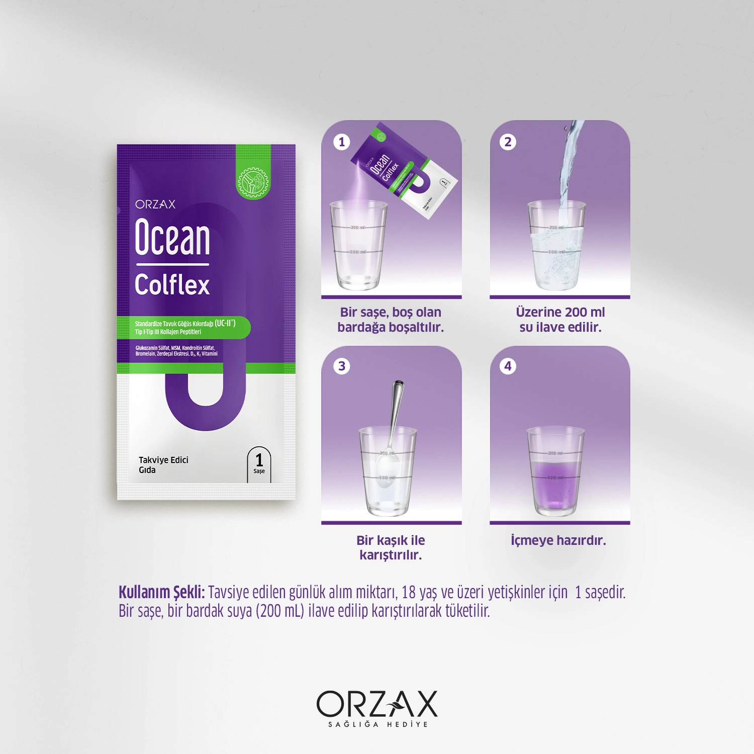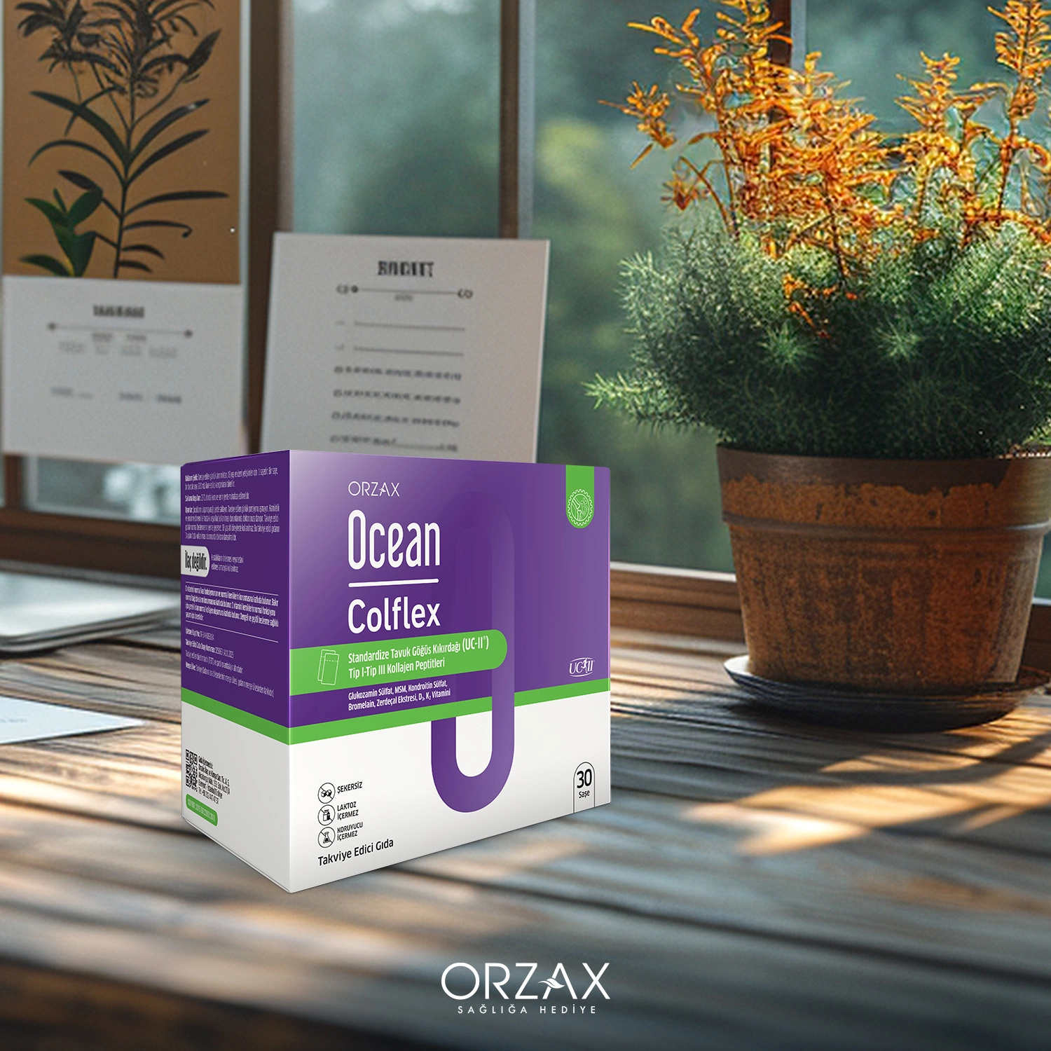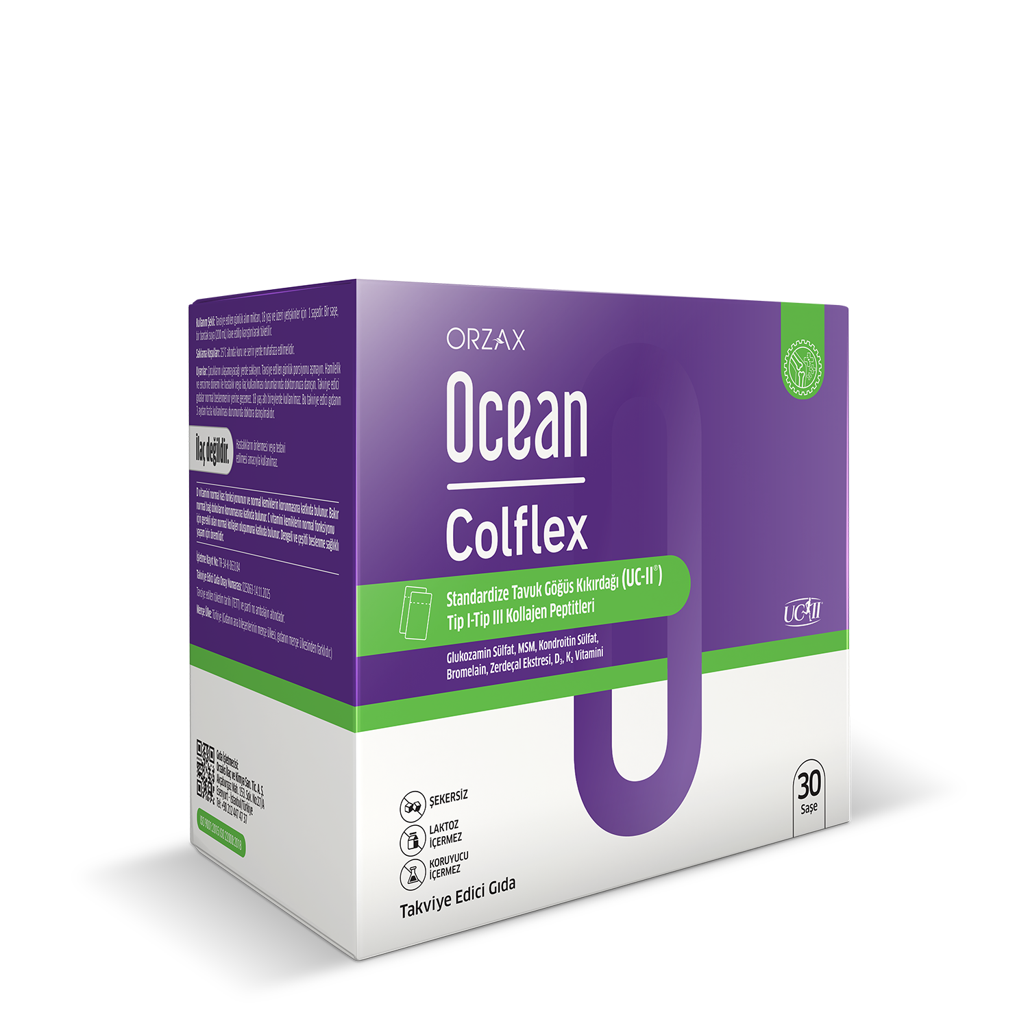 Ocean Colflex; Her saşede 40 Mg patentli UC -II Tip2 kolajen, 4960 Mg Tip1-3 kolajen peptitleri,bitkisel ekstreler, Glukozamin Sülfat, Kondroitin Sülfat,vitamin ve mineraller içeren bir gıda takviyesidir.Koruyucu, şeker, laktoz içermez.