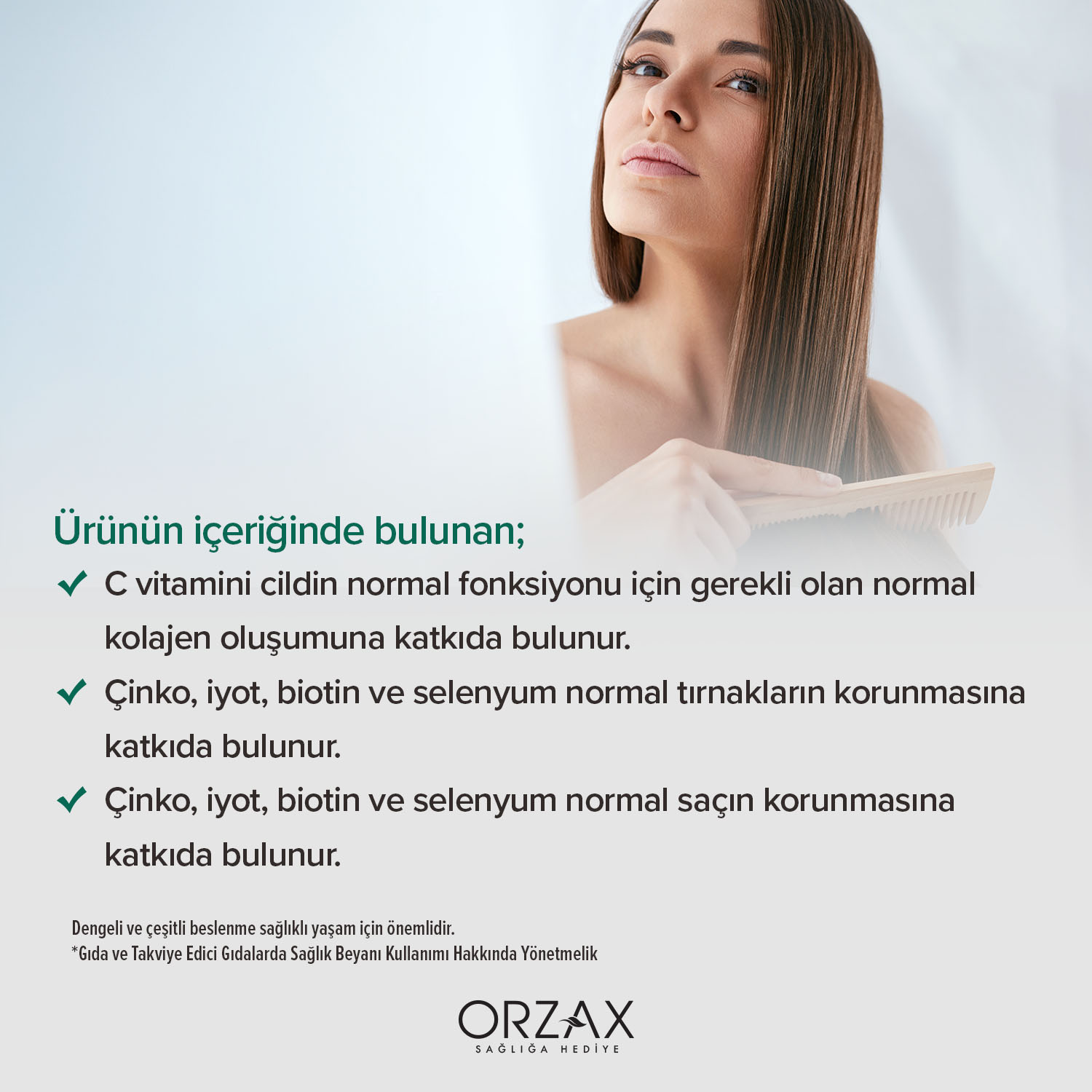 - Çinko, biotin ve selenyum normal saçın korunmasına katkıda bulunur.