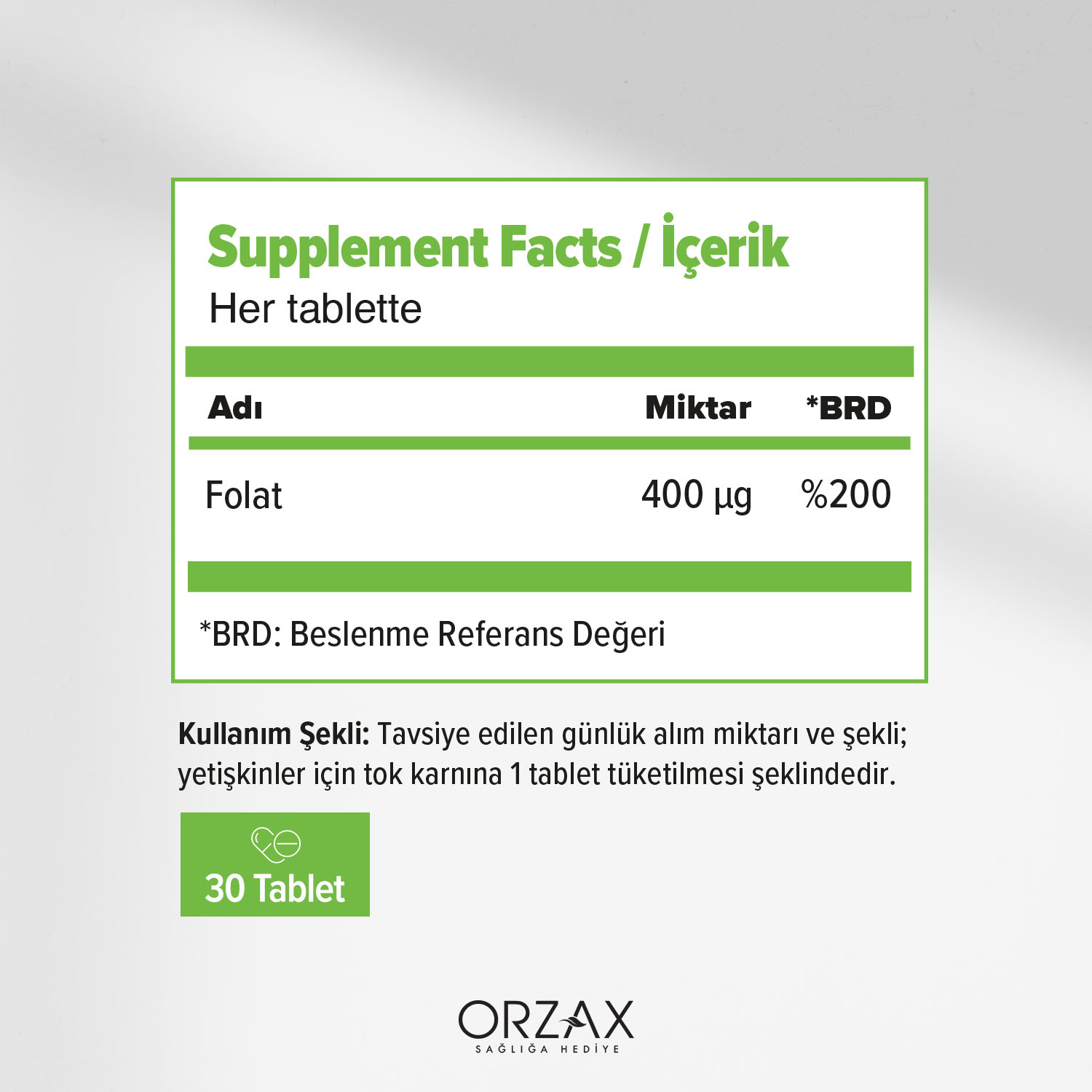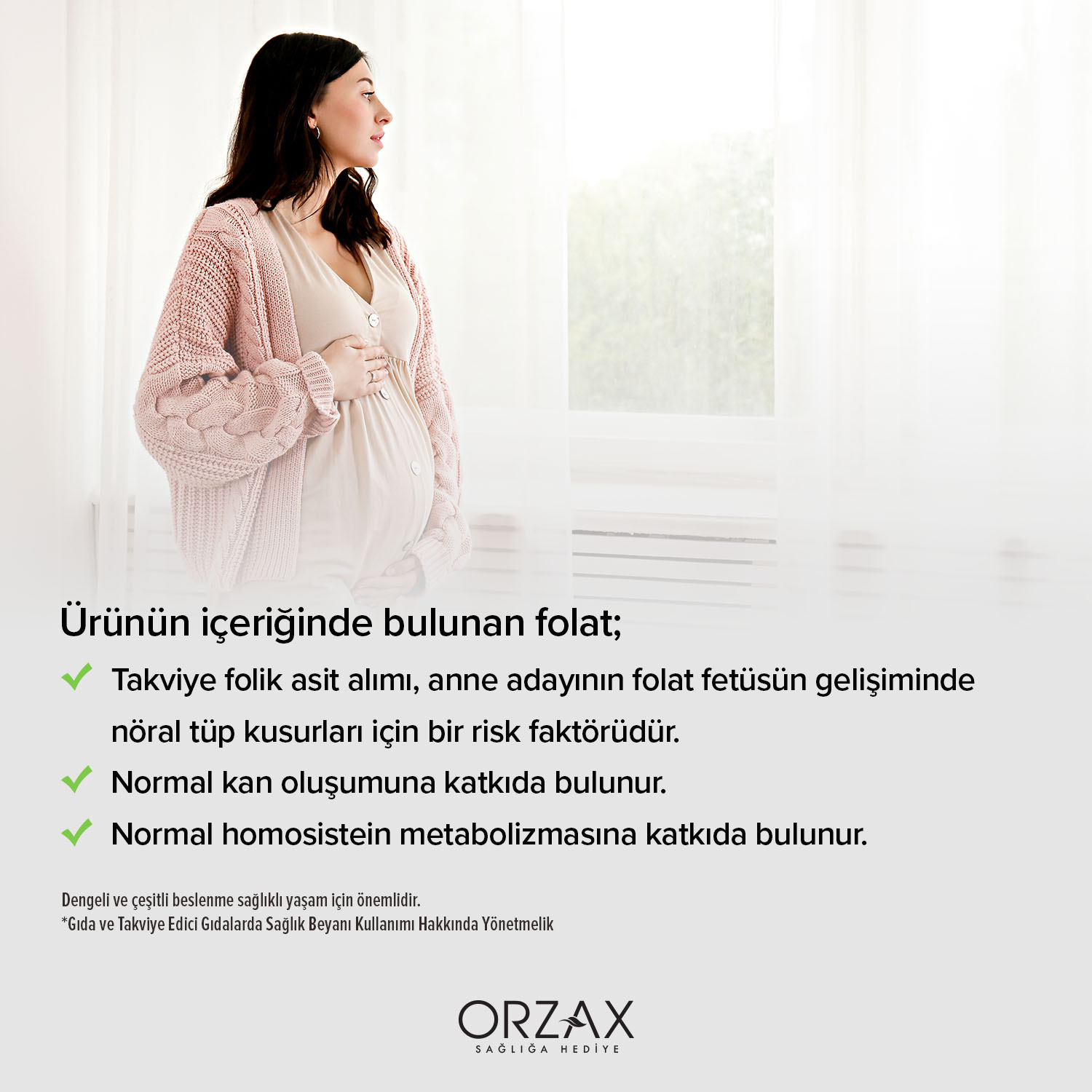 (**Hamilelik dönemindeki tüketiciye faydalı etkinin, gebelikten en az 1 ay öncesi ve 3 ay sonrasına kadar takviye olarak günlük 400 µg folik asit alındığında sağlanacağı bilgisi verilir.)