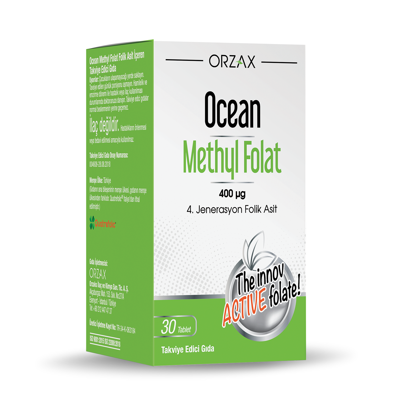 Ocean Methyl Folat, her 1 tabletinde Quatrefolic patentli aktif formda bir folik asit (folat) içeren bir gıda takviyesidir.
