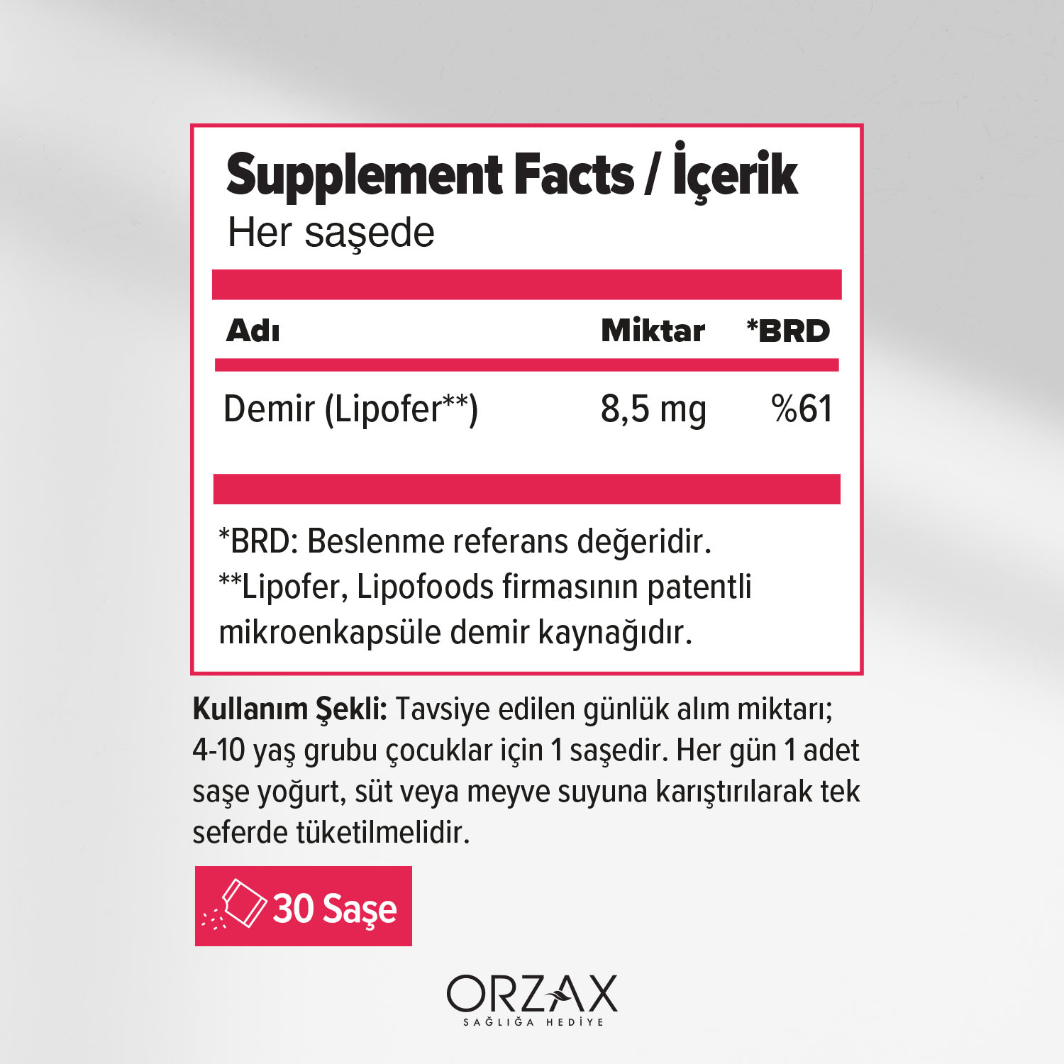 Ocean Microfer saşe, mikroenkapsülasyon teknolojisi ile üretilmiş demir içeren bir takviye edici gıdadır. Aç veya tok fark etmeksizin gıdalarla birlikte tüketilebilir. Aç veya tok farketmeksizin gıdalarla birlikte tüketilebilir.