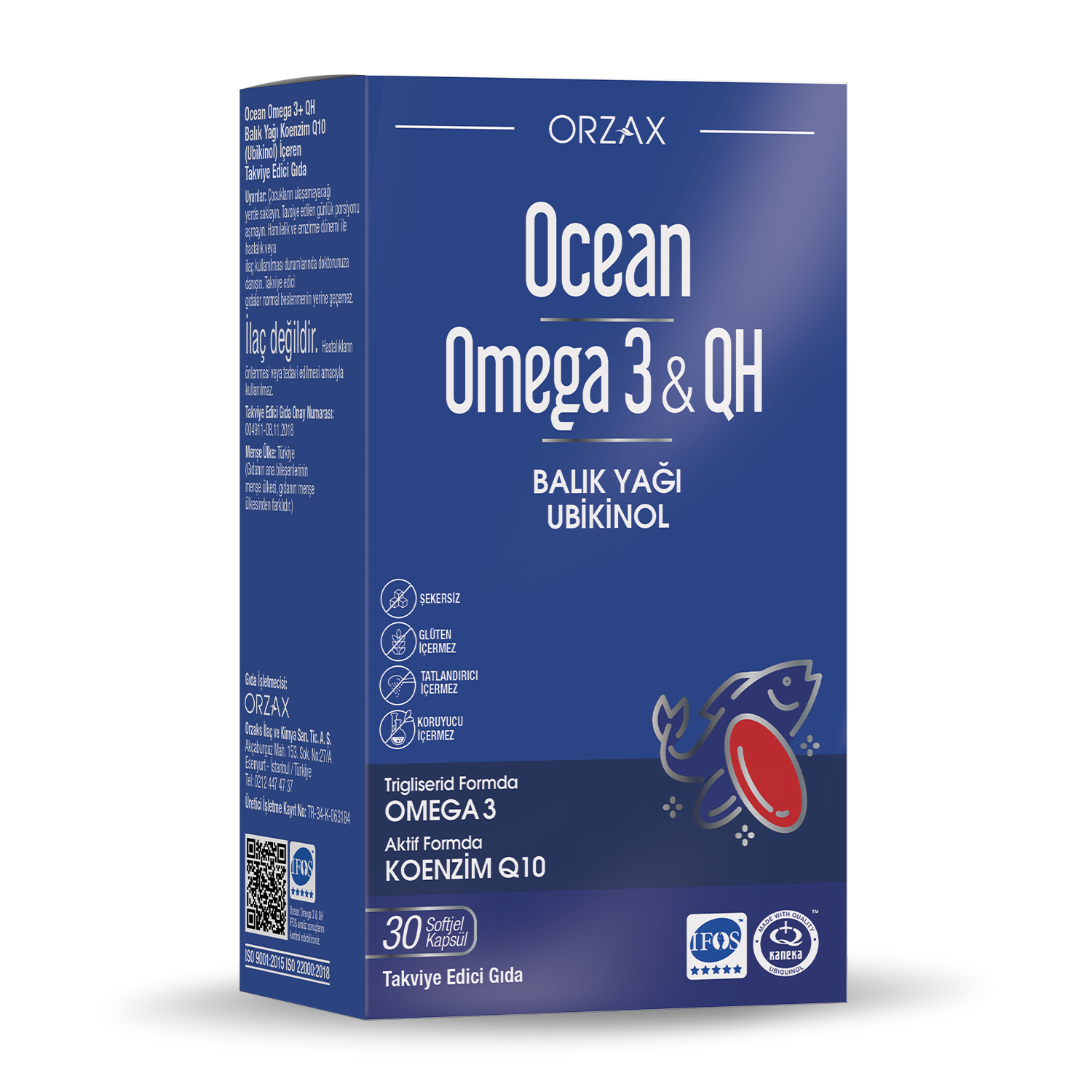 Ocean Omega 3 & QH, Koenzim Q10 (Ubikinol), EPA, DHA ve diğer Omega 3 Yağ Asitlerini çeren bir gıda takviyesidir. Ocean Omega 3 &QH’ın içeriğindeki balık yağı, kalitesi ve içerik garantisi açısından, International Fish Oil Standards (IFOS) tarafından analiz edilir. Beslenme Konseyi (CRN), Dünya Sağlık Örgütü (WHO), Küresel EPA ve DHA Organizasyonu (GOED) tarafından belirlenen limit değerlerine göre test edimiştir. IFOS 5 yıldız kalite onaylı olan ürün, saflık, tazelik ve içerik garantisi sunar.