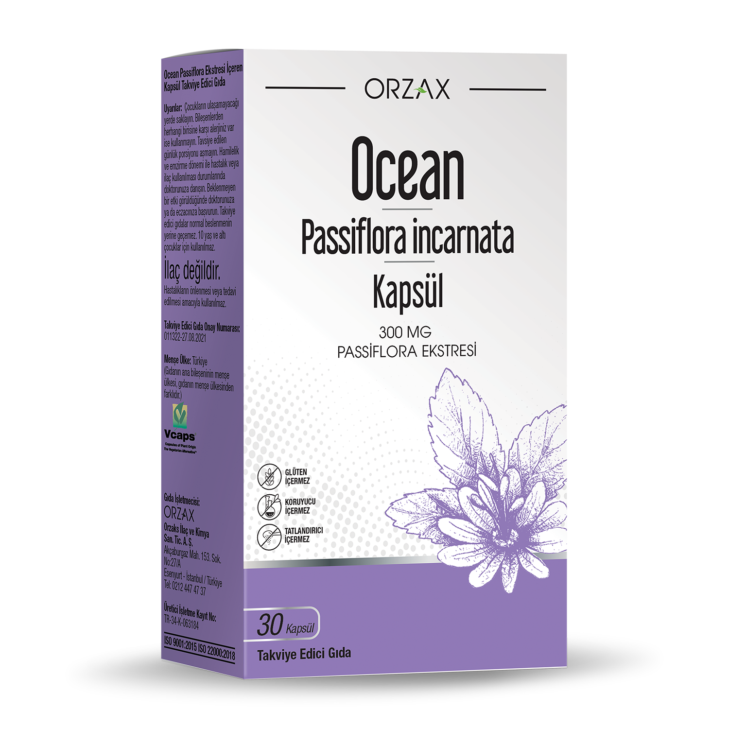 Passiflora incarnata, Passifloraceae familyasına özgü, yüzyıllardır tedavi amaçlı kullanılan bir bitkidir.Ocean Passiflora İncarnata Kapsül, her kapsülünde 300 mg Passiflora ekstresi içeren bir gıda takviyesidir. Ocean Passiflora İncarnata Kapsül, patentli Vcaps® kapsüllere sahiptir. Koruyucu, tatlandırıcı, glüten içermez.