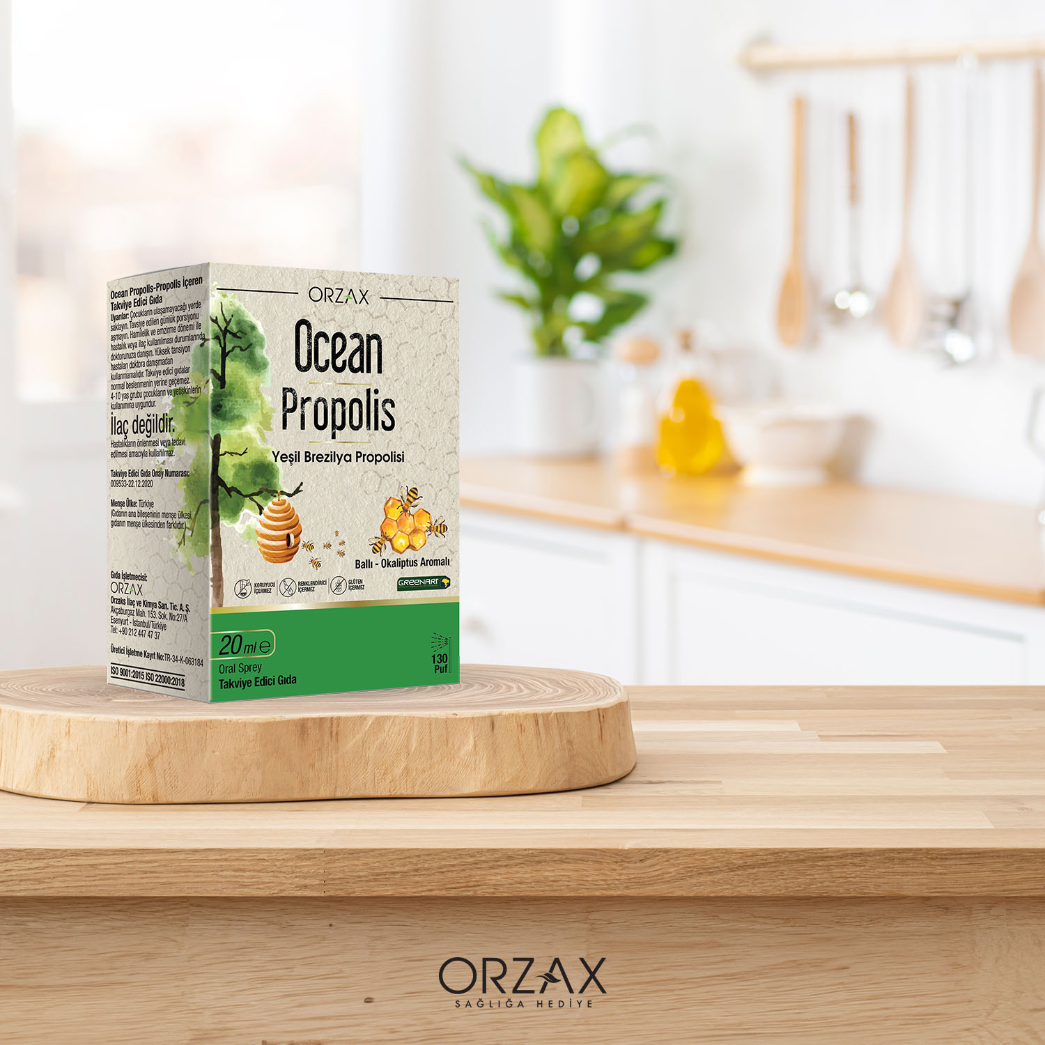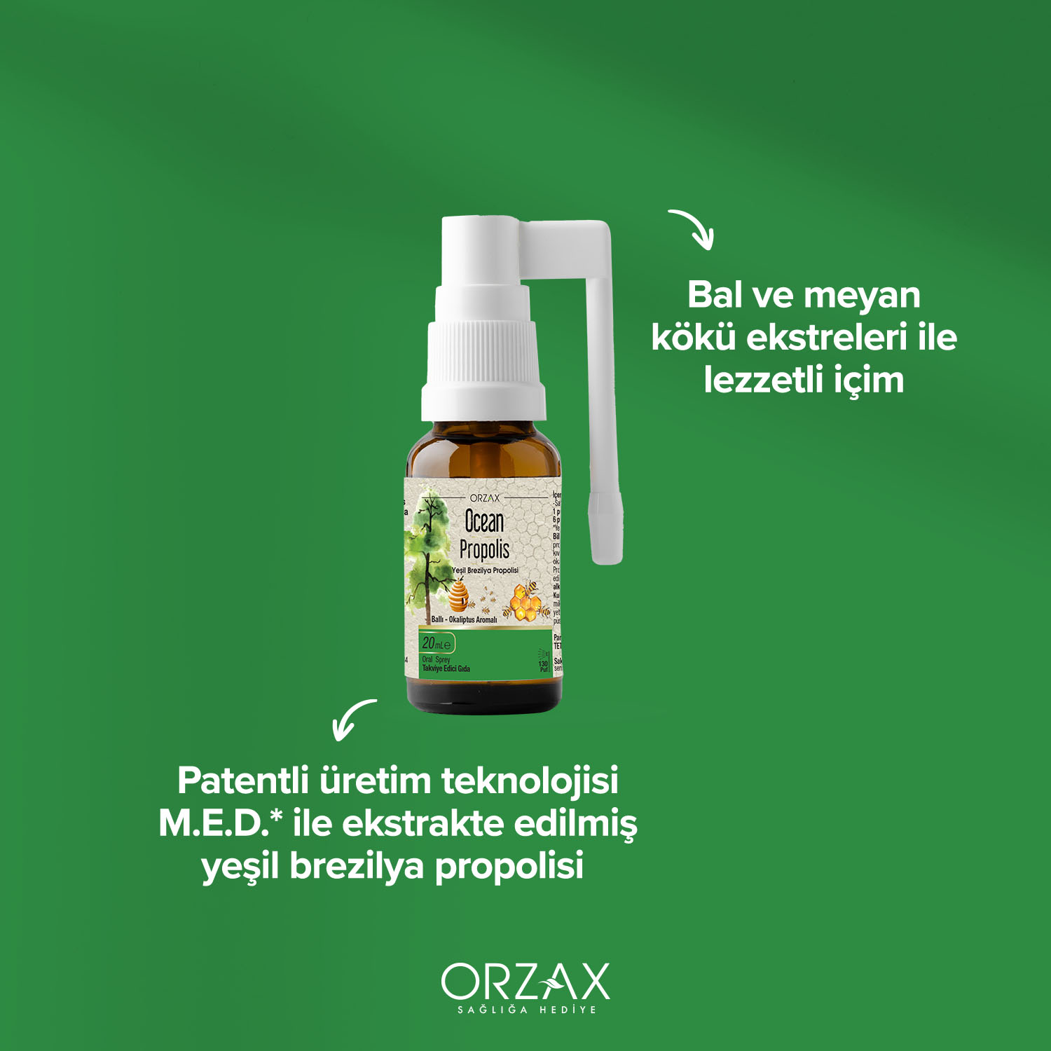 Ocean Propolis, patentli üretim teknolojisi M.E.D.* ile ekstraksiyon edilmiş Yeşil Brezilya Propolisi içeren gıda takviyesidir. Bileşiminde, Yeşil Brezilya Propolisinin majör bileşeni olan Artepillin-C içerir. Bal ve meyan kökü ekstreleri ile zenginleştirilmiş içeriğe sahiptir. Sprey formu ile kolay kullanım avantajı sağlar. Ballı-okaliptus aromalıdır. *M.E.D.: Bu ekstraksiyon yöntemi ile, polifenolik bileşenler standardize, saf ve yüksek konsantrasyonda elde edilir. Patent-MI2014A001434