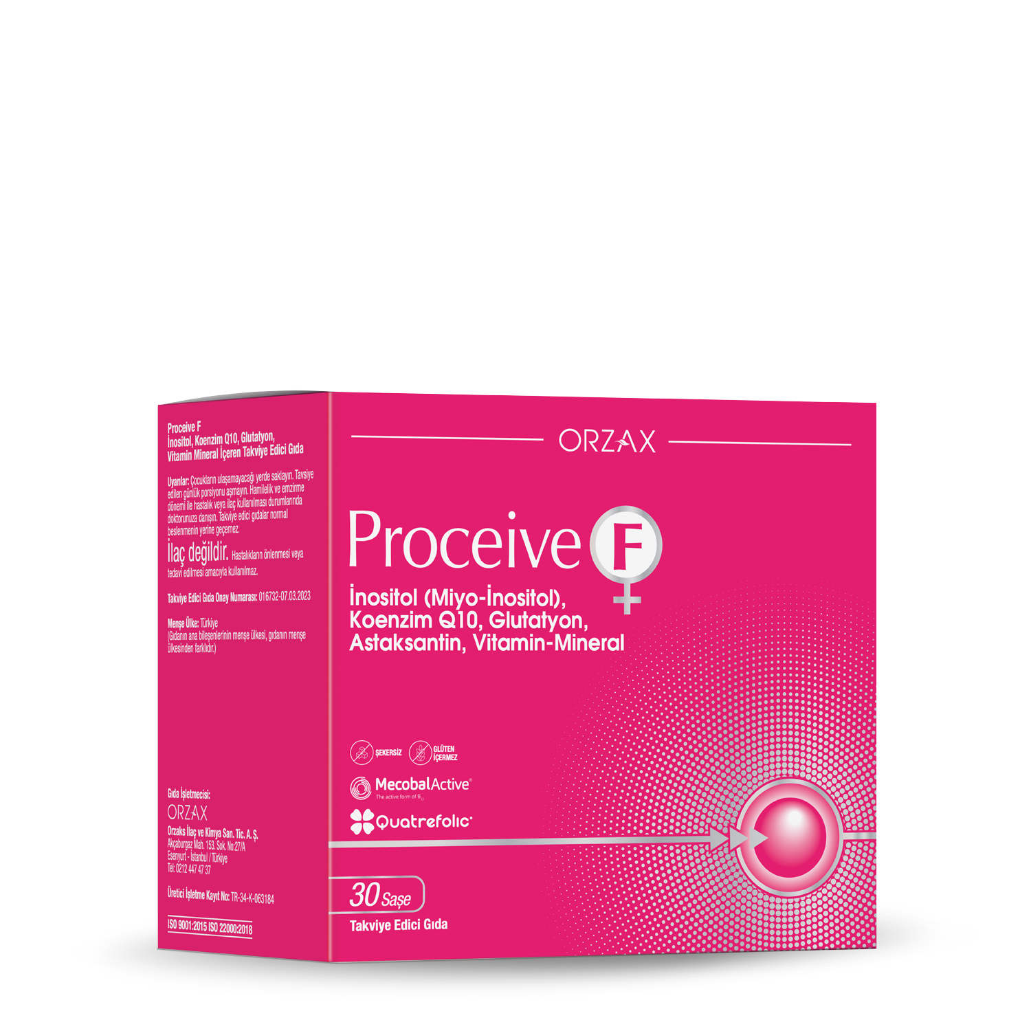 Proceive F, inositol, koenzim Q10, glutatyon, vitamin ve mineral içeren bir gıda takviyesidir. İçerdiği MecobalActive patentli aktif B12 vitamini ve Quatrefolic patentli aktif folik asit ile optimum fayda sağlar. Şeker ve glüten içermez.